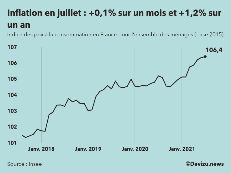 Selon les données définitives publiées par l’Institut national de la statistique et des études économiques (Insee) à 8h45, l’indice des prix à la consommation en France s’est établi à 106,4 points en juillet 2021 (base 100 en 2015). Ainsi, l’inflation ressort à +0,1% sur un mois et à +1,2% sur un an.
