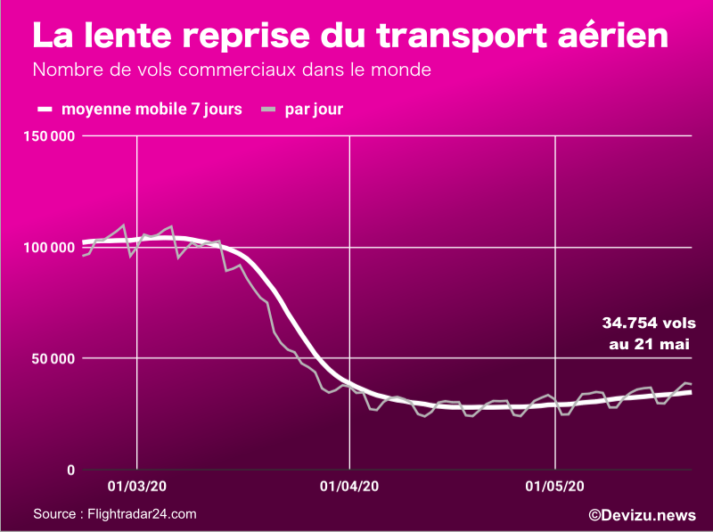 >> Depuis ce point bas, aidé par le déconfinement et le redémarrage de l’activité en Asie, le trafic aérien repart très progressivement. Au 21 mai, Flightradar24 a compté 34.754 vols commerciaux. Cette reprise provient essentiellement du trafic domestique et du cargo.